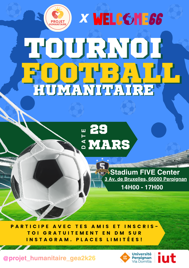 Dans le cadre de notre projet humanitaire, nous avons le plaisir d’organiser un tournoi solidaire en collaboration avec Welcome 66, avec qui nous avons déjà eu la chance de collaborer par le passé. L’événement se déroulera le dimanche 29 mars, de 14h à 17h, au Stadium Five Center de Saint-Charles.